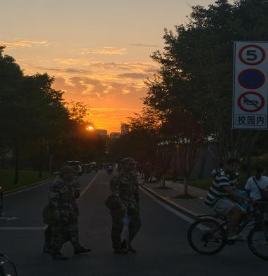 而当训练的疲惫遇上晚霞的温柔,便有了动人画面。走在校园的路上,夕阳把天空晕染成橘红色的绸缎,一身迷彩的我们,与骑行的同学、漫步的行人交织成独特的校园景致。这一刻,军训的苦累仿佛被晚霞的柔光消解,只剩下青春的鲜活在空气中跃动。说来也确实如此,军训的时光,从不是单调的重复,而是有着“刚柔并济”的双重底色。